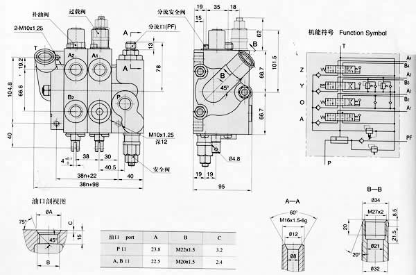 1.基本特点 CDB2-F15型系列多路换向阀集稳定分流阀与多路换向阀于一体,使车辆供转向系统与油缸工作系统共用一个油泵,减少了系统结构的复杂程度,便于安装和维修。该阀具有功能齐全,性能先进,结构紧凑,安全可靠,维修方便等特点,主要适用于1~3.5吨位叉车,小型装载机,还可用于其它起重运输机械、矿山机械、环卫机械的液压系统中。 ★内置稳流阀:进油体内带有稳流阀,为转向系统提供稳定的流量。 ★内置单向阀:每联换向体都有内置单向阀,防止油液倒流,克服执行机构“点头”现象。 ★设置阀杆自锁:防止叉车门架因倾斜缸内部负压可能引起的震动,并且当发动机熄火时锁住倾斜缸,避免误动作使叉车门架前后倾斜,造成安全隐患。 ★采用分片式结构,1~10联内任意组合。 ★操作方式:手动、液控 ★附加阀:换向体的两端,根据需要可加过载阀或补油阀。 ★阀杆中位机能:A、O2、O、Y等。 2.性能参数